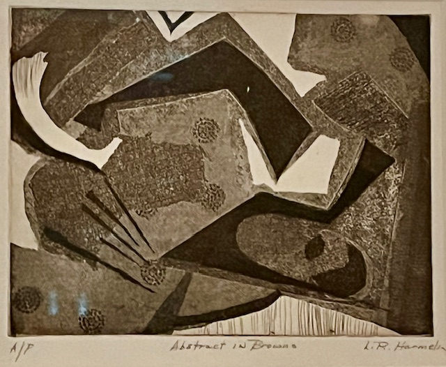 An abstract composition built from layered, textured forms in rich brown tones. Geometric shapes overlap and intersect, creating depth and movement while subtle patterning adds visual interest. The piece feels grounded and tactile, with an earthy, modern sensibility.