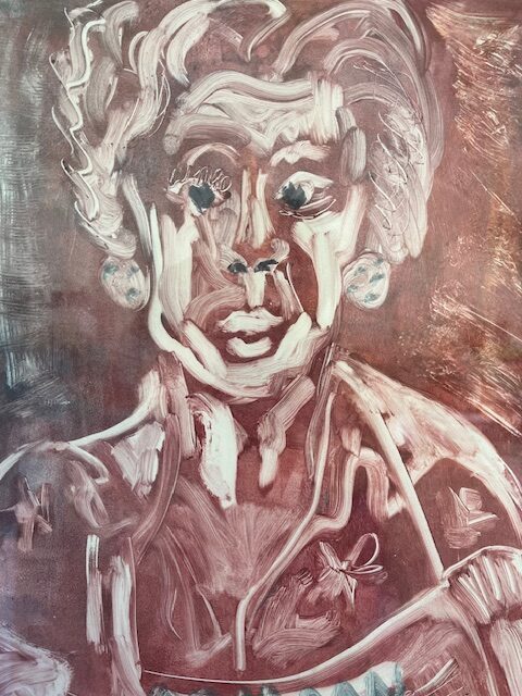 A bold, expressive portrait defined by raw, gestural brushwork and a limited, earthy palette. The figure emerges through layered strokes, giving the face a sculptural, almost carved quality. The overall composition feels immediate, emotional, and unfiltered.
