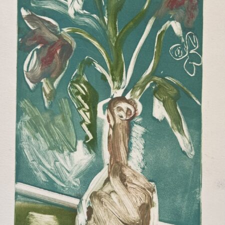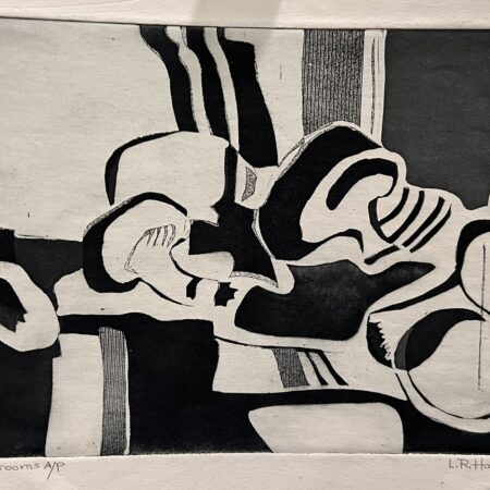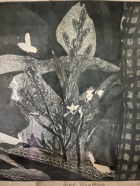 A striking monochromatic composition built through layered textures and organic forms. Botanical elements emerge and dissolve within a rich, abstract surface, creating depth and visual intrigue. The contrast of light and dark, along with intricate patterning, gives the piece a moody, contemporary edge.